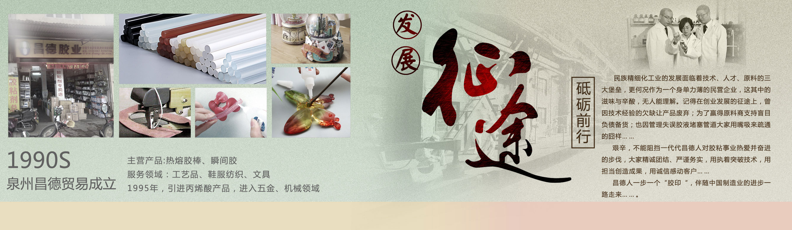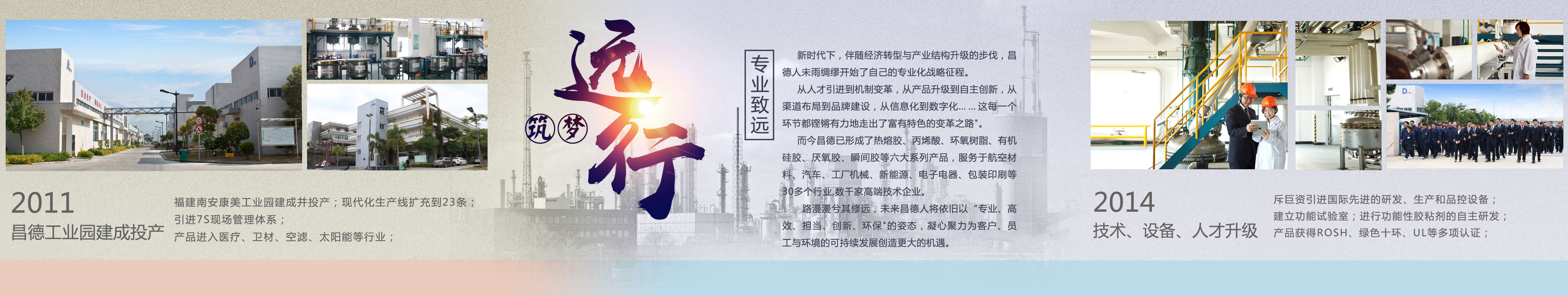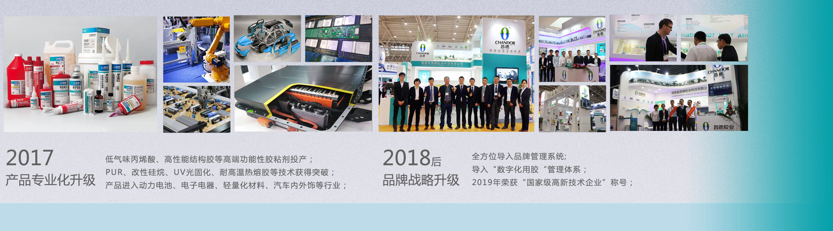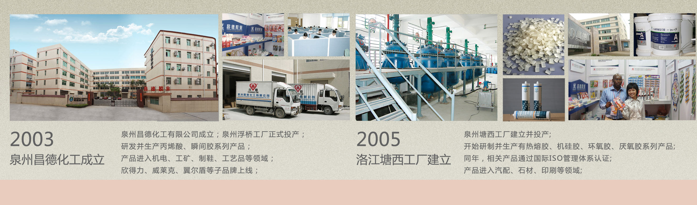 福建省昌德胶业科技有限公司是一家从事工业粘胶剂、密封胶研发、生产、销售的高新技术型企业。自1990年成立以来,以可靠的产品和服务,帮助客户解决制造、装配、维修等领域的粘接密封问题。